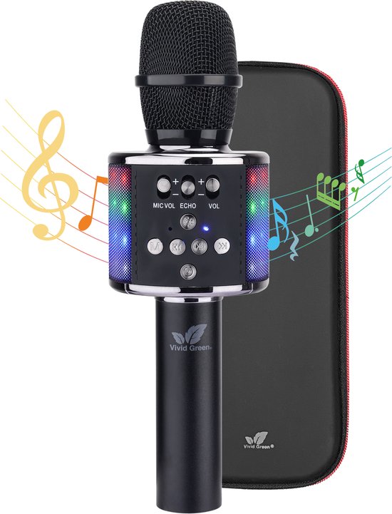 Deze karaoke microfoon van Vivid Green is een gebruiksvriendelijke keuze met duidelijke knopjes op de microfoon zelf. Je geniet van vijf stemvervormers, ingebouwde lampjes en 5-6 uur batterijduur. Je kunt meezingen, afspelen en geluid opnemen tijdens het zingen.